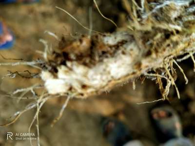 There are some kind of roting near the grond or above the root of plant abd a white thing is also there