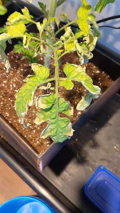 Asalam alaykum Samira, the plant is currently indoors under artificial lights and the soil is dry. Last feeding was last week. It's potentially an iron issue but looks more like a potassium deficiency maybe?