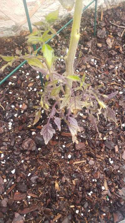 I bought a Roma tomato plant and transplanted it over a month ago. Almost immediately, the leaves and stems began turning purple and yellow. There are flowers buds that have been there for weeks but never bloomed. The growth has stopped and it's not producing.