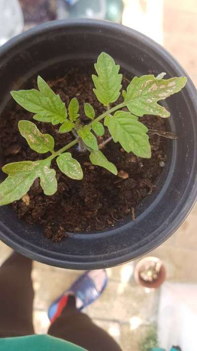 Hey fellow planters! Did my baby tomatoe catch something or is it a sun burn? Thank you