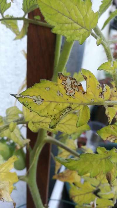 First the branches started to hang a little bit and got yellowish. Now I notice holes on leaves (even the youngest of them), flowers getting dry before growing fruits and some small black dots gathered in some of the leaves. Please help me with some advice, I really love my little tomato :(