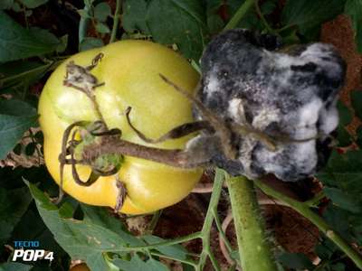 The tomato plant's leaves are wilting and look wrinkled and a rot has attacked the tomatoes leaving them with an extremely thin outer skin.
