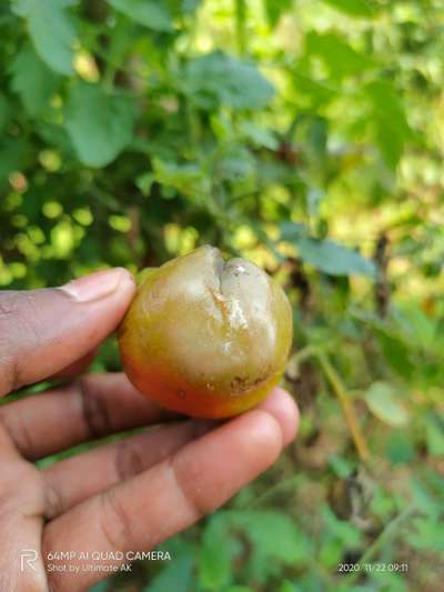 Hi Ajith Kumar . It looks like Sunburn and Growth Cracks in Tomato . Click on green links for checking symptoms and taking control measures from Plantix library. Ahain - Better to send clear and closer day time full plant direct field pictures with your proper query again please.
