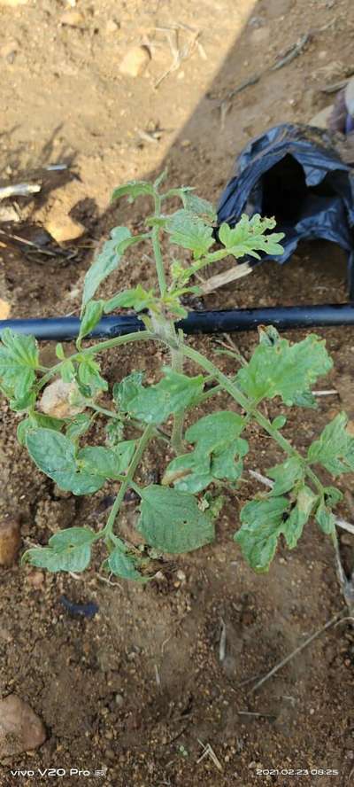 Hi Karthik. I am not sure, but compare symptoms with Herbicide Growth Damage , Leaf Miner Flies , Aphids Tobacco Caterpillar and ase" target="_blank" href="/en/library/plant-diseases/600020/flea-beetles/">Flea Beetles effect carefully by clicking on green links for taking control measures from Plantix library. Also need to apply good amount of well decomposed Farm Yard manure or Vermicompost along with recommended dosage of fertilizers of your area to get good growth and productivity. Apart, you can also use or create a "Cultivation Tips" for Tomato crop in Plantix. It provides you information on how to optimize your crop production.