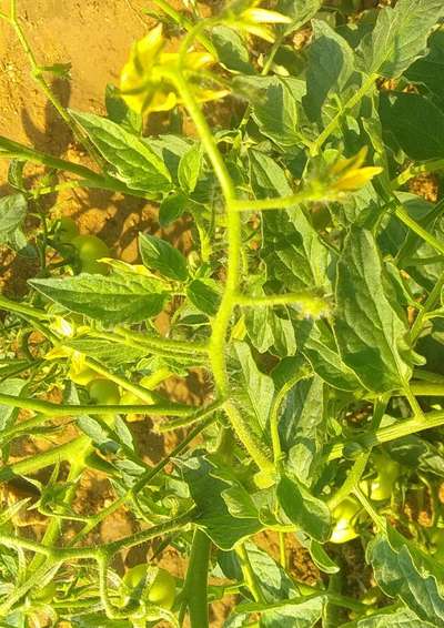 Hi Sri . As per your sent image and explanation - your Tomato crop showing symptoms of Aphids and Nitrogen Deficiency . Click on green links for checking symptoms and taking control measures from Plantix library. Also need to apply good amount of well decomposed Farm Yard manure or Vermicompost along with recommended dosage of fertilizers of your area or you can also use fertilizer calculater available here on home page of Plantix to get good growth and productivity. Apart, you can also use or create a "Cultivation Tips" for Tomato crop in Plantix. It provides you information on how to optimize your crop production.