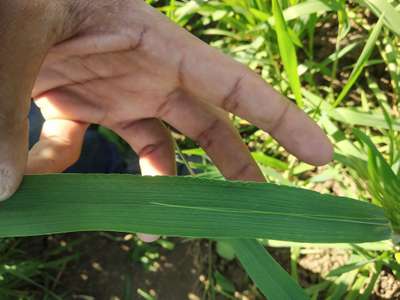 This is wheat the seed is about to develope with in 2 weeks and the plant is very healthy but on some of the leaves this type of cuts are seen only on one side of leaf, there are neither pest nor and fungus .