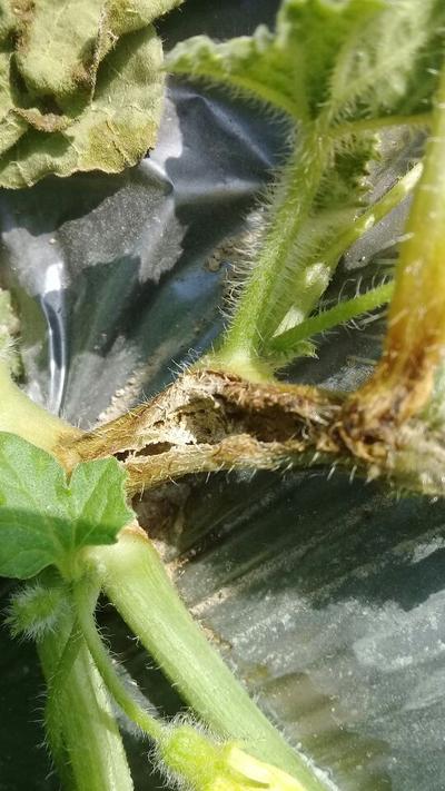 The symptoms are caused by the fungus Stagonosporopsis cucurbitacearum, that can infect a number of crops of this family. The pathogen may be carried in or on infested seed. In the absence of host plants, it can overwinter for up to one year or more on infected crop residue. In spring, when the conditions are favorable, spores are produced, which serve as the primary source of infection. Moisture, relative humidity over 85 percent, rainfall and duration of leaf wetness (from 1 to 10 hours) are determining for a successful infection and the development of symptoms. The optimal temperature for the disease varies depending on the speices in question and varies from about 24°C in watermelon and cucumber to about 18°C in muskmelon. Penetration by spores is probably directly through the epidermis and does not need to occur through stomata or wounds. Wounding, infestation with striped cucumber beetles, and aphid feeding, along with powdery mildew infection, predispose plants to infection.