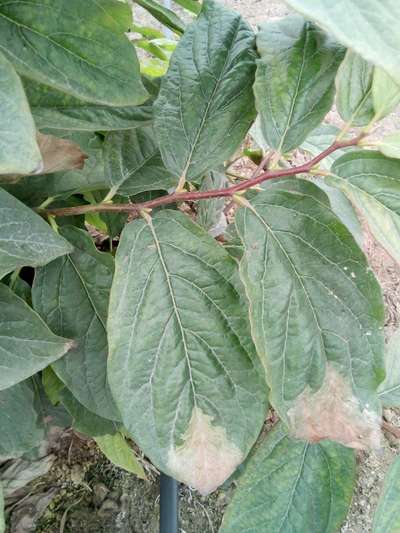 La imagen son hojas de kaki, y presentan las puntas quemadas