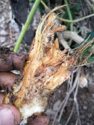 Cultivo de tallota. Rep. Dom. La planta se está secando y en las raíces presenta pudrición.