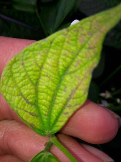 Las hojas mas viejas se pusieron amarillas. Algunas tienen manchas por los bordes y amarillos