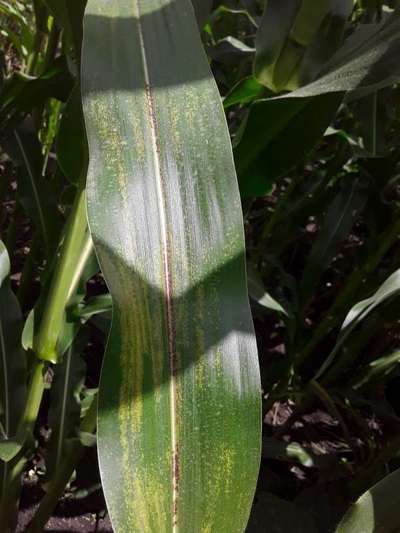Estoy haciendo un proyecto para mí escuela. El proyecto consiste en el riego por goteo pero también nos enfocamos en las plantas, la cosa es que yo plante algunos maizes. Ha estado lloviendo mucho así que los tenía dentro de mi casa y hoy cuando llegué de la escuela me encontré con estas manchitas en una de las hojas del maíz. No sé que puede ser ¿Tiene que ver con qué no le ha estado dando el sol? O ¿Es alguna enfermedad?
