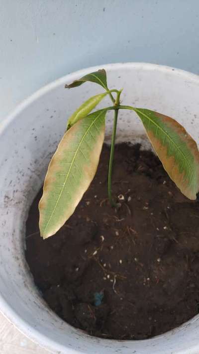 Germiné una semilla de mango y se dió en color rojizo, luego la transplante a maceta y todo iba bien, hasta que empezó a tornarse café de sus 3 hojitas, y las nuevas se empezaron a enroscar.
