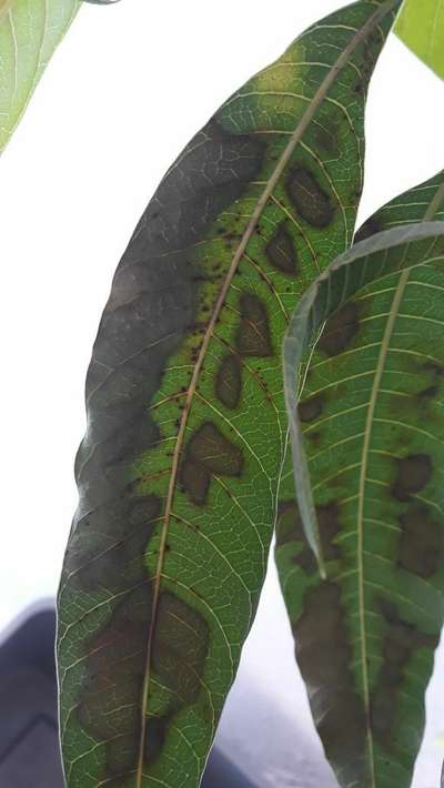 ¿Por qué mi planta de mango tiene manchas oscuras irregulares en las hojas?