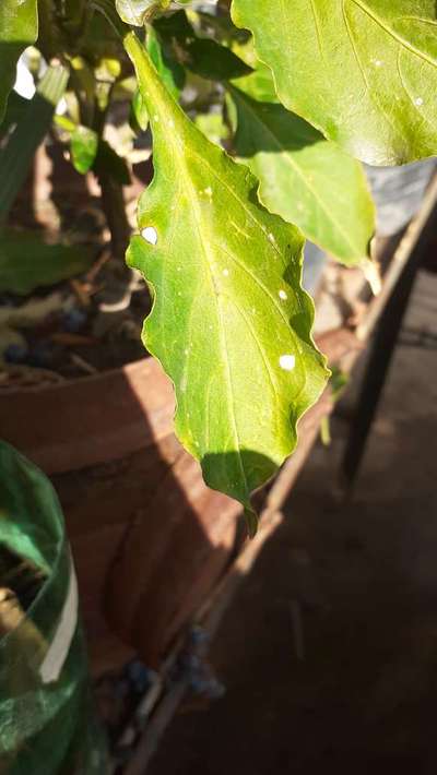 Se forman manchas blancas que con los dias van oscureciendo y se vuelven marron hasta que se seca la hoja