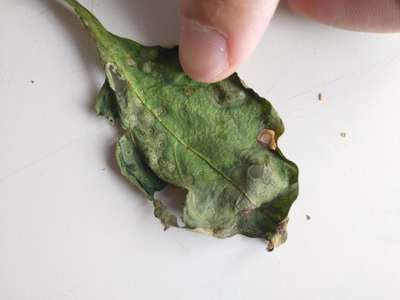 Hojas presentan mancha circular oscura rn el centro y hacia los bordes de va aclarando.