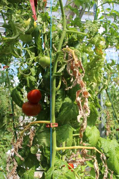 Las hojas secas los pedúnculos amarillento, marchitamiento en las hojas. Pudrición en los pedúnculos y tallos mancha necroticas en hojas
