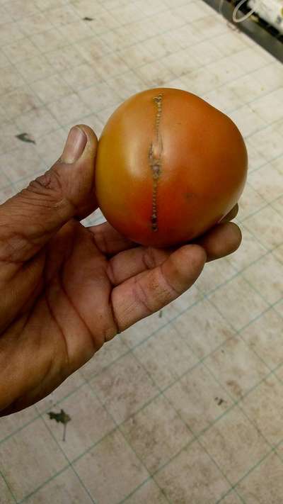 Hi Jorge Mora ! This is Zippering of tomatoes. Zippering usually occurs when the anther of the tomato flower sticks to the developing fruit and produces a scar as the fruit grows, extending from the blossom end to the stem. Sometimes an open hole develops in addition to the scar. The only control is to select varieties that are less prone to zippering (Look-alikes: Catfacing, growth cracks). For your reference I have uploaded pic of zippered fruits of tomato. Thanks for visiting plantix community