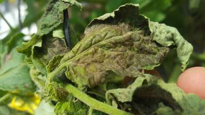 Hace tres semanas que trasplanté esta tomatera de tomates raf y las hojas viejas se han retorcido y les han salido manchitas de color oscuro, con un borde más oscuro aún. También tienen unos puntitos amarillos que intuyo que pueden ser causados por la lluvia. ¿Qué puede ser? Gracias