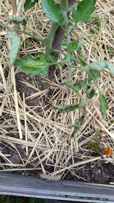 Hace tres semanas que trasplanté esta tomatera de tomates raf y las hojas viejas se han retorcido y les han salido manchitas de color oscuro, con un borde más oscuro aún. También tienen unos puntitos amarillos que intuyo que pueden ser causados por la lluvia. ¿Qué puede ser? Gracias