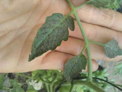 Manchas oscuras en hojas superiores del tomate
