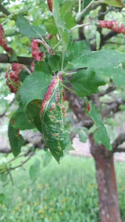 Hello dear Arnaud Kientzler how are you dear the symptom is seem to be Redcurrant Blister Aphid, Peach Leaf Curl dear 2 gm acetamiprid+2 gm coppor and after 5 days spray amino acid
