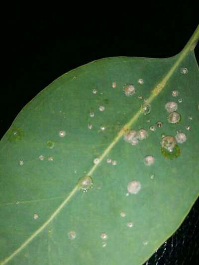 Ça ne ressemble pas à la cochenille. sur la feuille d'eucalyptus des oeufs protégés par une sorte de coquilles collés les uns contre les autres !