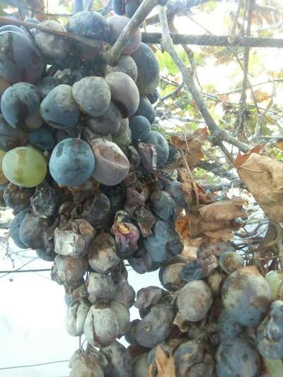 ce genre de problème débute par l'oidium que vous auriez du traiter ,après éclatement des baies c'est le botrytis qui vient s'installé.