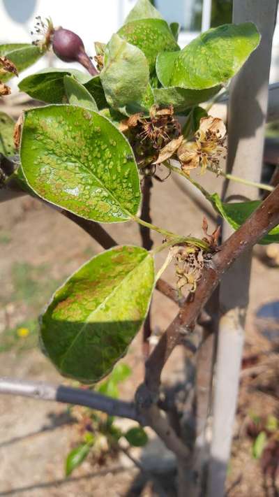 Bien que le poirier se porte bien en général, les feuilles sont a moitié noircit ainsi que les bouts de quelques tiges