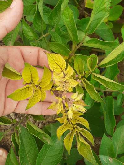 Comme visible sur la feuille les nervures jaunissent avant le limbe puis la feuille devient marron et se necrose
