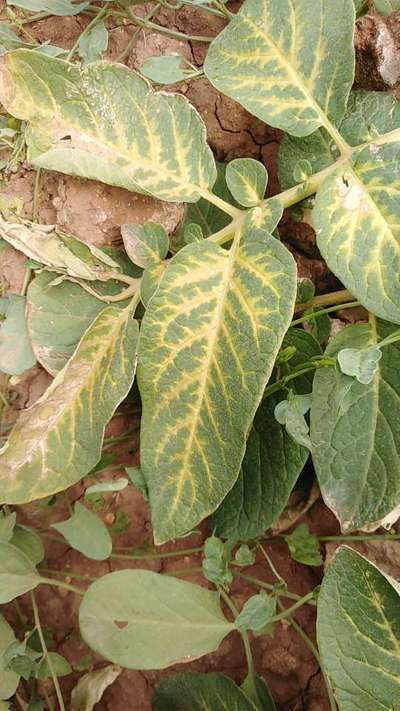 En savoir plus sur PlantixComme visible sur la feuille les nervures jaunissent avant le limbe puis la feuille devient marron et se necrose