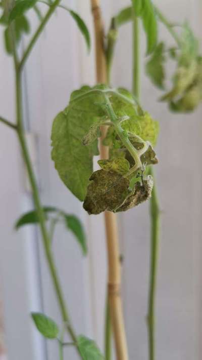 Après avoir fait hier la pulvérisation de mes plantules de tomates qui étaient attaqué par les mineuses, je les retrouvé ce matin enroulé sur eux-mêmes comme s'il s'était tordu eux même.