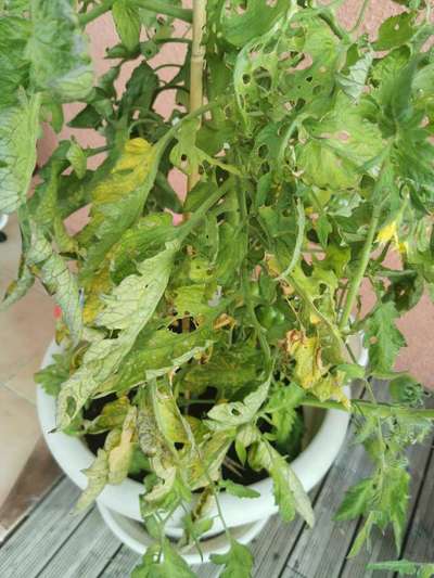 Il y a 15 jours j'avais des pucerons j'ai arranger avec du savon noir mélanger à l'eau je n'en ai plus, mais voilà que la tomates et même les feuilles ce font manger, je ne voit pas d'insecte dessus, les feuilles du bas sont jaunes et légèrement enrouler, et celle du haut sont très jolie, il est en pot je larrosse tous les soirs le pied et bien gros et pousse bien mais je 'e sais ce qu'il ce passe à cette allure nous ne pourrons pas manger les tomates 😌