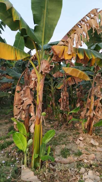 Kele ke patte pile pad kar sukh ja rhe hai. Aur tane phat ja rhe hai jiske karan paudha sukh ja rha hai.