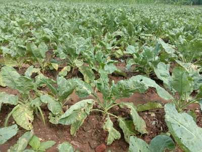 पत्तियां स्वस्थ जड़ स्वस्थ पत्तियों में काला महू लगी हुई एवं फूल के ऊपर कालापन है