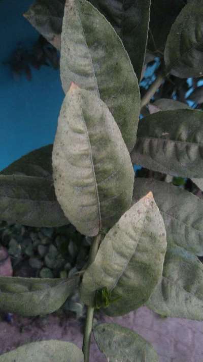 mosambi का पौधा है और पत्ते मुड़े हुए हैं पत्ते एक जैसे नहीं हैं पत्ते पीले हो रहे हैं