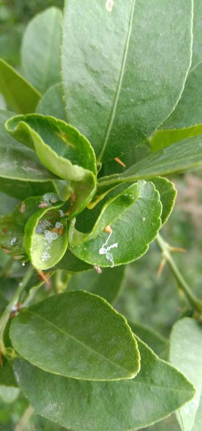 Nimbu ka podha h Patte mud chuke h aur patto pe dhabbe bhi h pile bhi ho chuke h Pls help kare.