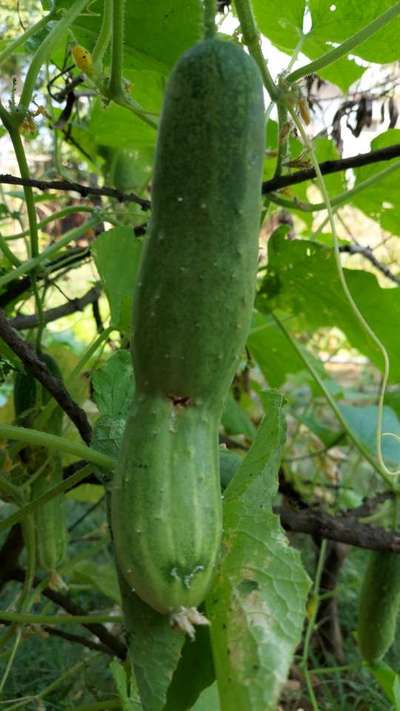 खीरे के फल के बीच मे किसी कीड़े का प्रकोप लग रहा है इस कारण खीरा बीच मे सिकुड़ गया है।