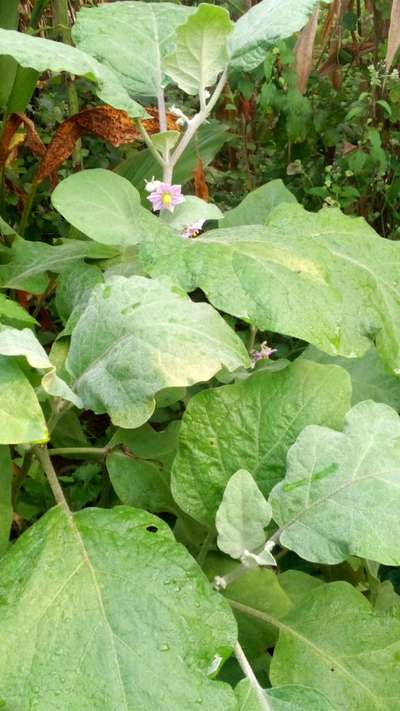 Baingan Mein Patiya Pili ho rahi hai aur Phoolon Phool Girte Hain Aur dalon Ke Madhya Mein piliya Lag Rahi Hai