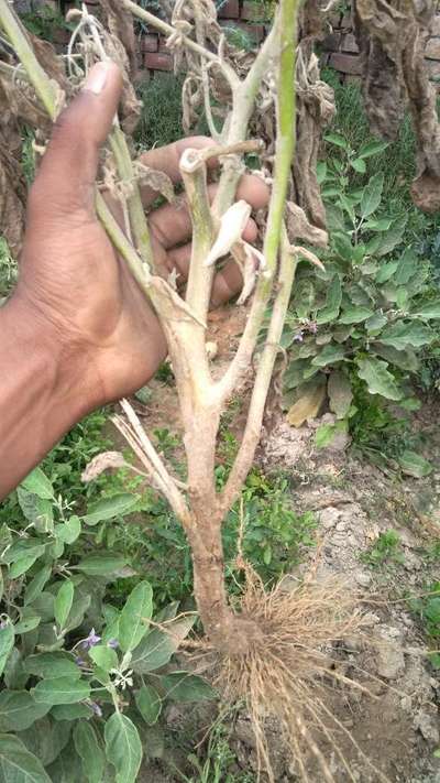 मेरे बैगन के किसी एक टहनी मे सफ़ेद रंग का दाग की तरह लग कर धीरे धीरे बढ़ते हुए पूरे पौधे को चपेट मे ले रहा है पूरे खेत मे बहुत तेजी से बढ़ रहा है सक्रमित डाल को छुने पर डाल गिला उसका चमड़ा सड़ रहा है कृपया दवा क्या करू