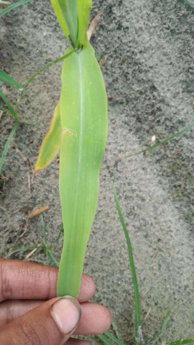 लगभग आधी खेत मैं पत्तियां का रंग हल्का हो गया है और पौधे कमजोर दिख रहे हैं