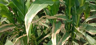 मक्का के ताने के पास की पत्तियो में धब्बे बन कर पत्तियां चूख रही हैं