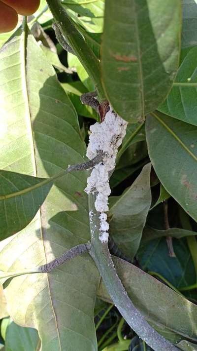 पेड़ की सम्पूर्ण डालियो तनो ओर नव अंकुरित डालियो पर पत्तियों पर बहुत अधिक मात्रा में ये सफेद कीट रुई के समान चिपका हुआ है पानी डालने पर इसमें से से हल्के पीले रंग के किट निकलते है