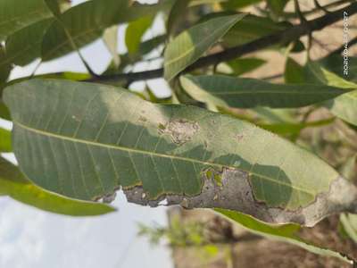 Aam ke per ka patta me chhed hona. Uske bad patta ka jala or sukhna