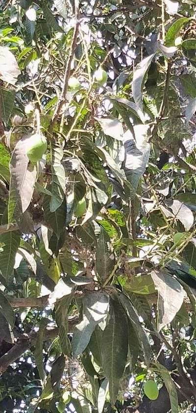 पत्तियां राख जैसे पदार्थ से ढक गई है और आम के फल तेजी से गिर रहे हैं।