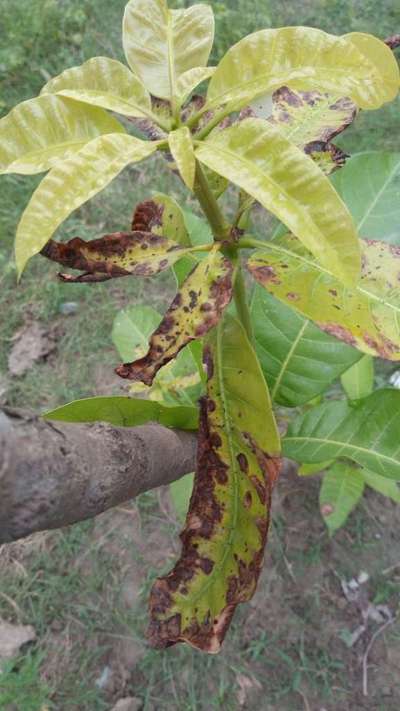 आम के पत्तों पर काले रंग के दाग धब्बे फफूंद का प्रकोप रोकथाम के लिए कारबन्ङाजीम 50%WP 50 ग्राम 15 लीटर पानी में घोलकर छिड़काव करें