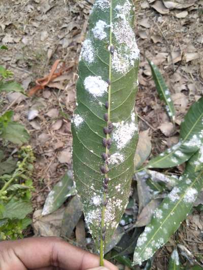 पत्तियों में फफूंद के साथ भूरे रंग का किट चिपका हुआ है,कीटों को हटाने की कोशिश करने पर पीले रंग का तरल निकलने लगता है।