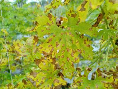 करेले की पत्तियां पर पीले धब्बे और कोने-कोने से पत्तियों का सुखना ना पूरी बेल का पीला होना इसको कैसे ठीक करे