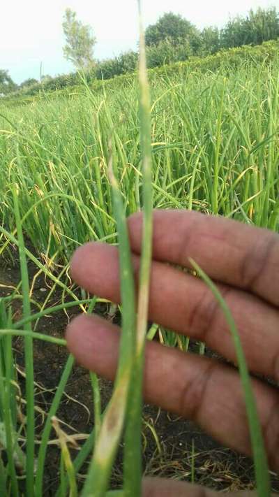 हरी नारायण जी यह Purple Blotch of Onion का प्रभाव है। धिक जाणकारी के लिये उपर दिये लिंक पर क्लिक किजीए। धन्यवाद