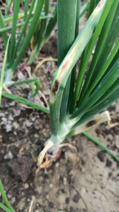प्याज की पत्तियों में काले धब्बे पड़ रहे हैं और ऊपर से सुखा रहे हैं