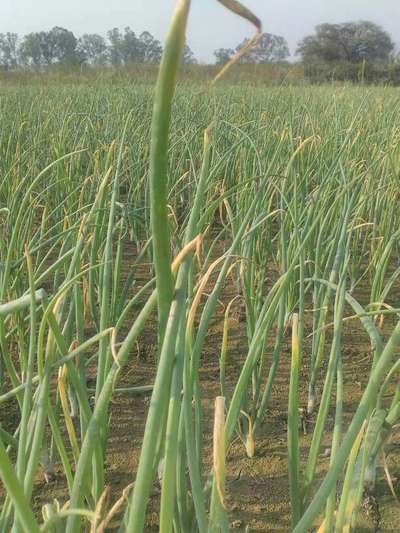 प्याज की पत्तियों में काले धब्बे पड़ रहे हैं और ऊपर से सुखा रहे हैं